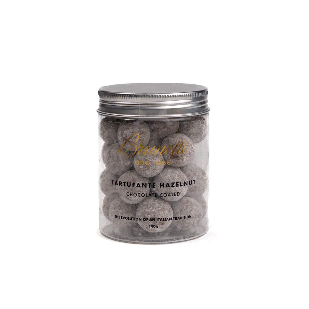 Freshly roasted Hazelnuts coated in milk chocolate and gianduia and dusted in icing sugar