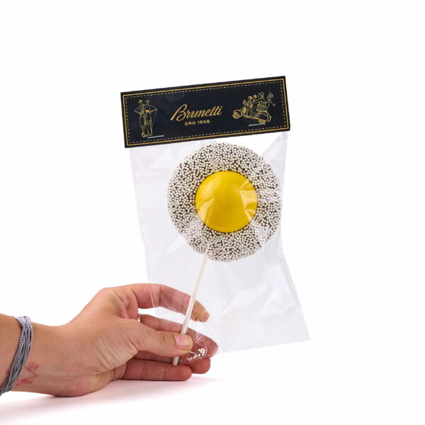 Handcrafted from smooth premium chocolate and finished with delicate crunchy sugar pearls, this Easter lollipop is designed to resemble a sunny-side Easter egg — making it a fun and elegant treat for children and adults alike.