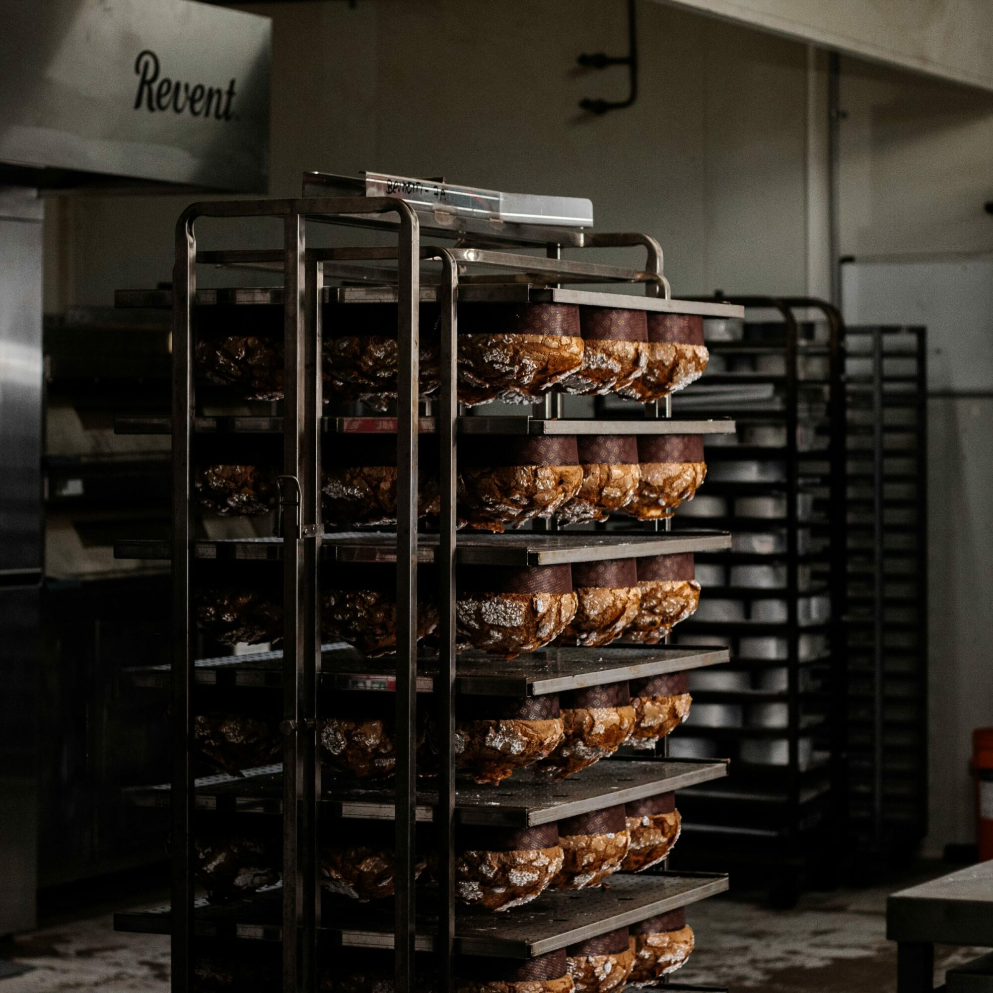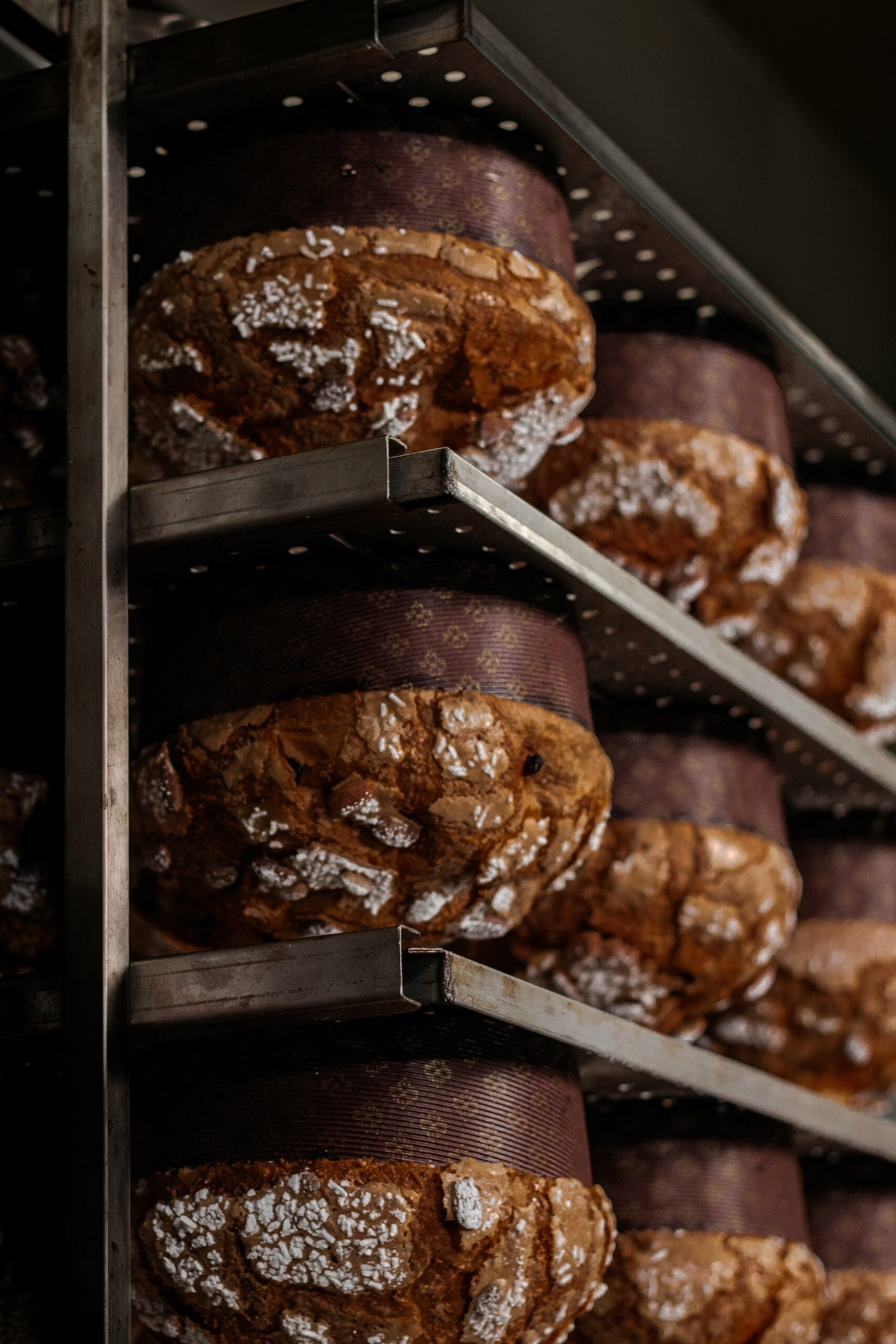 One of the most fascinating parts of our Panettone-making process is the unique way it’s cooled — upside down for over 12 hours! After baking, each Panettone is skewered and placed on a special rack that’s flipped upside down the moment it leaves the oven.
